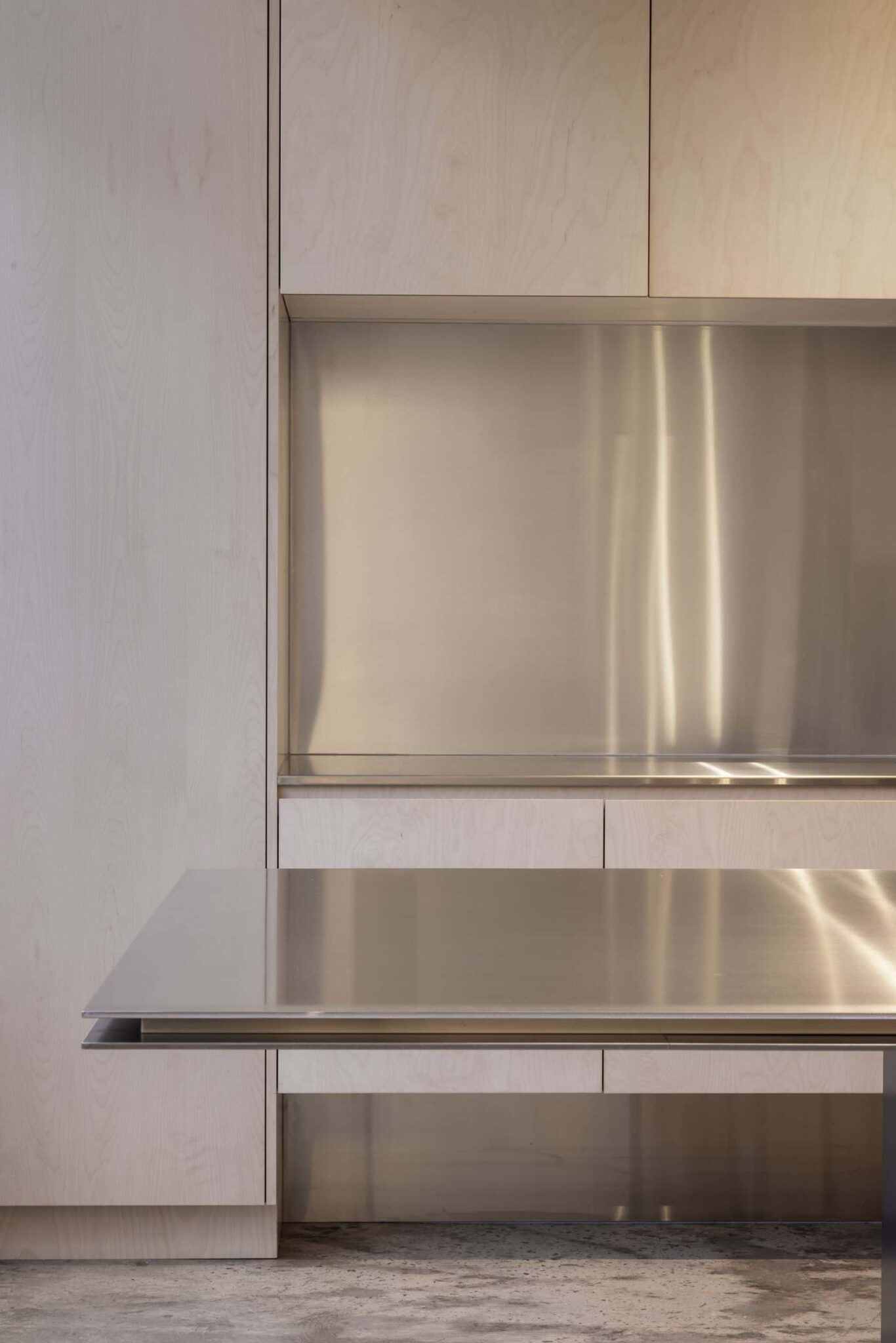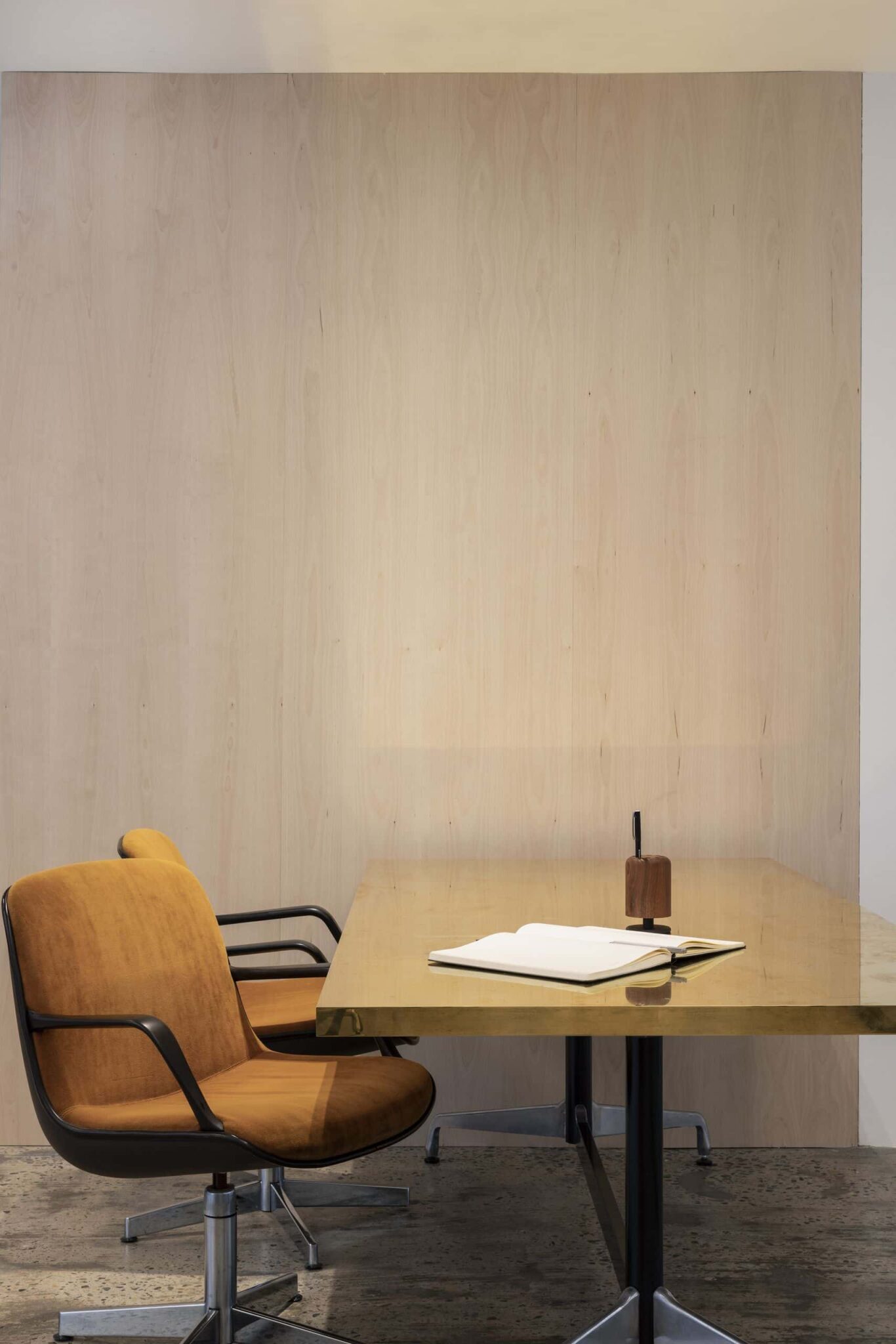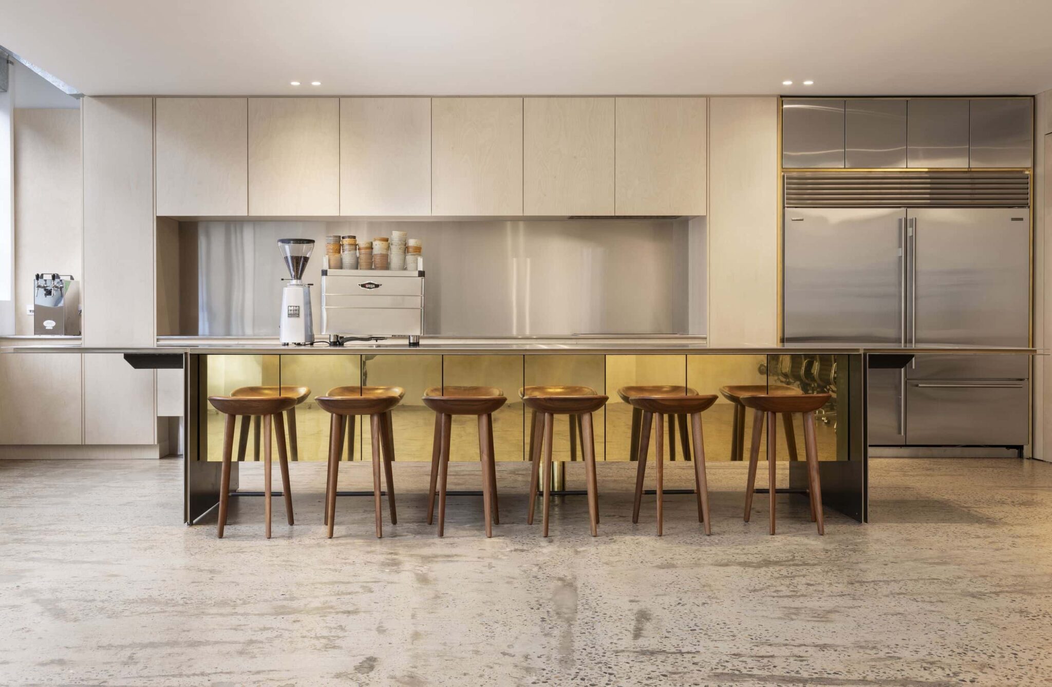 Level 2 contains the kitchen, boardroom, and private office. The kitchen—crafted from brass and stainless-steel joinery with a polished concrete floor—serves as a functional and social hub, supporting informal interaction and daily rituals. Floor-to-ceiling glass partitions mirror the rhythm of the original steel windows, allowing light to filter through while maintaining acoustic separation.