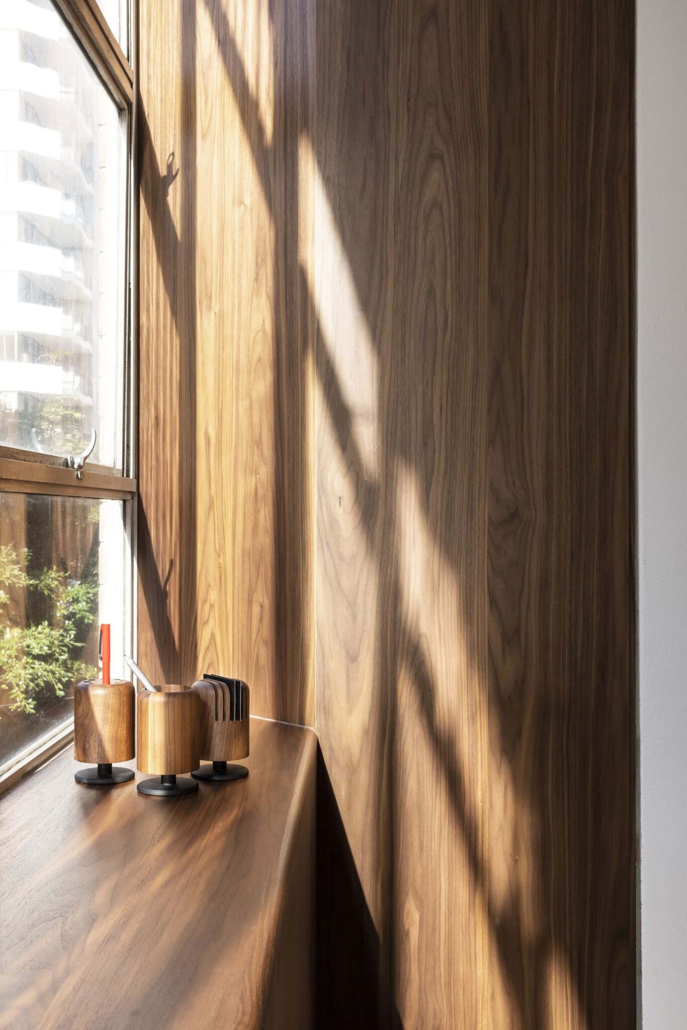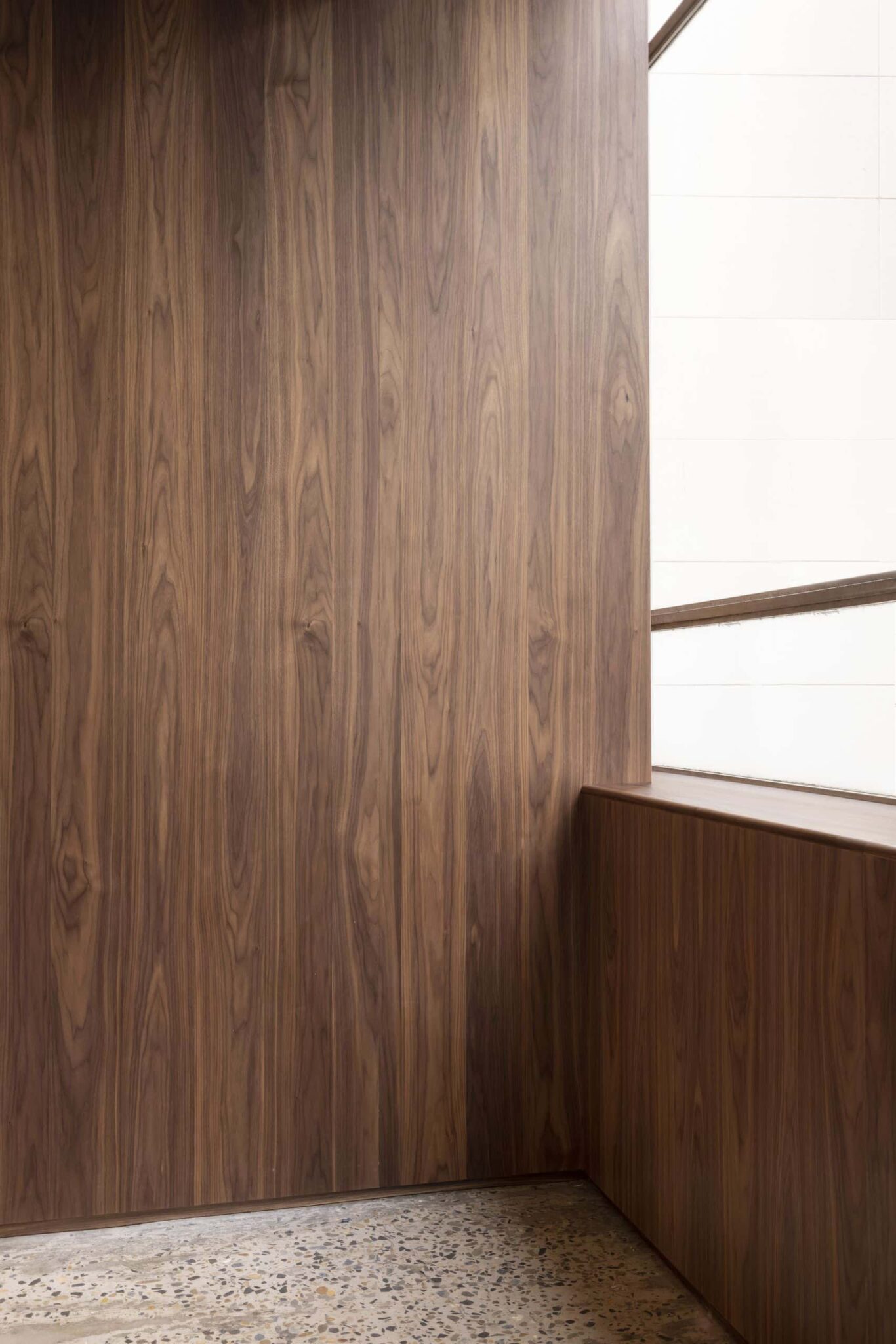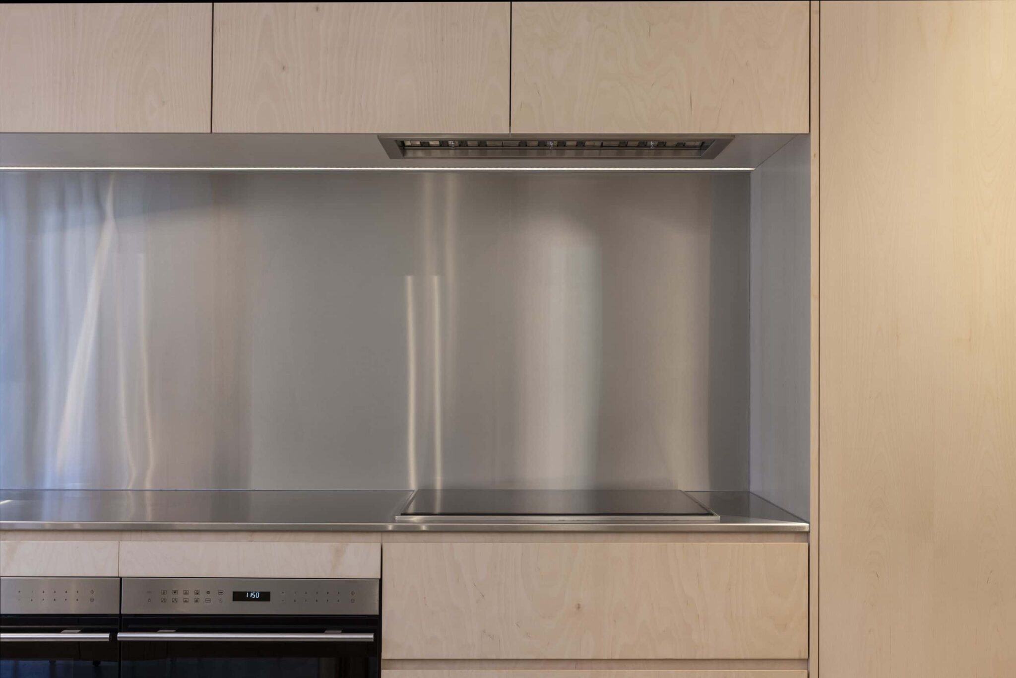 Level 2 contains the kitchen, boardroom, and private office. The kitchen—crafted from brass and stainless-steel joinery with a polished concrete floor—serves as a functional and social hub, supporting informal interaction and daily rituals. Floor-to-ceiling glass partitions mirror the rhythm of the original steel windows, allowing light to filter through while maintaining acoustic separation.