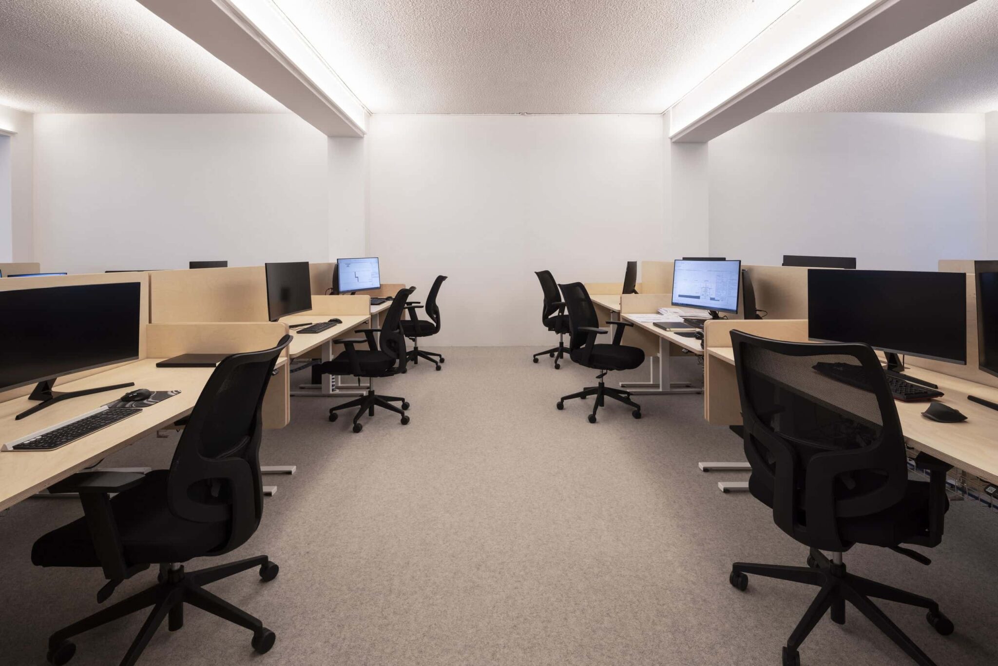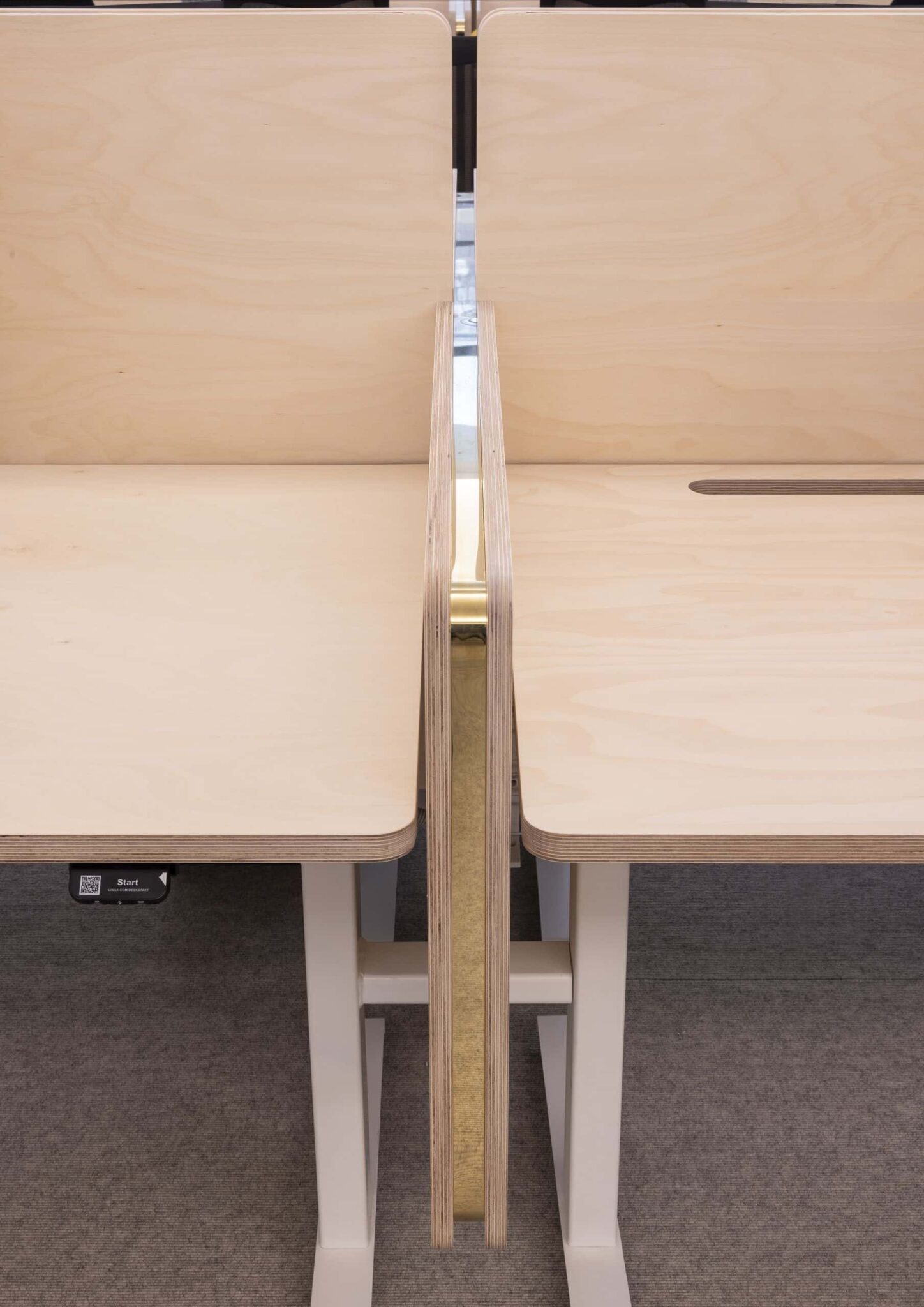 The new layout maximises the building’s double frontage, drawing daylight deep into both levels and establishing a sense of transparency throughout. Level 1 accommodates an open-plan workspace with custom standing-desk joinery, a restrained palette of light finishes, and blue-toned carpet to anchor the space. The simplicity of the detailing enhances flexibility and reinforces a calm, cohesive atmosphere conducive to focused and collaborative work.
