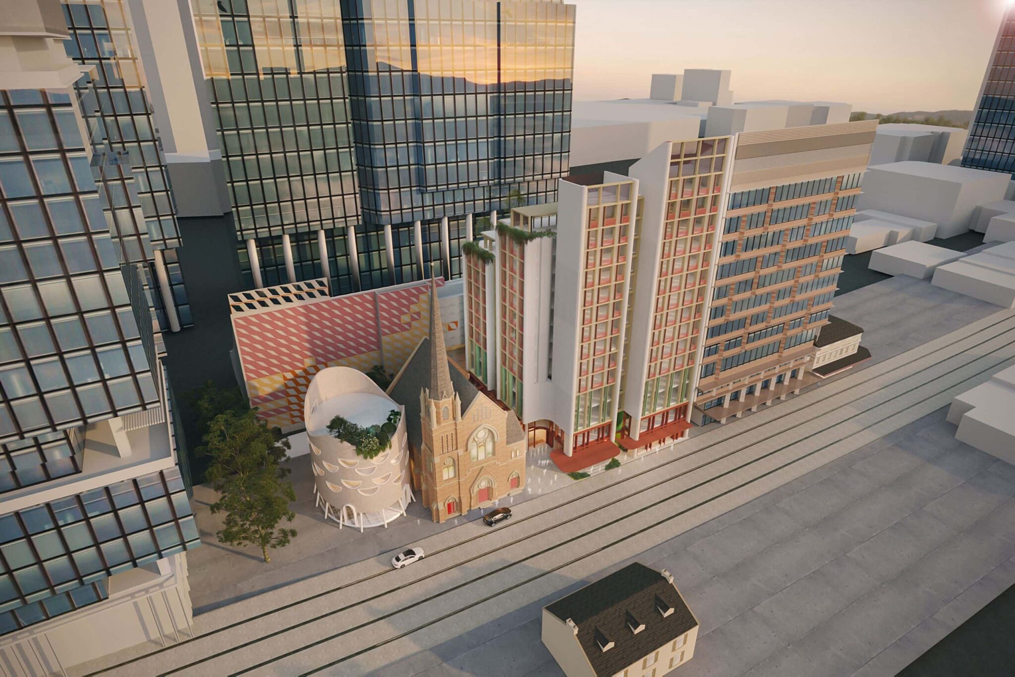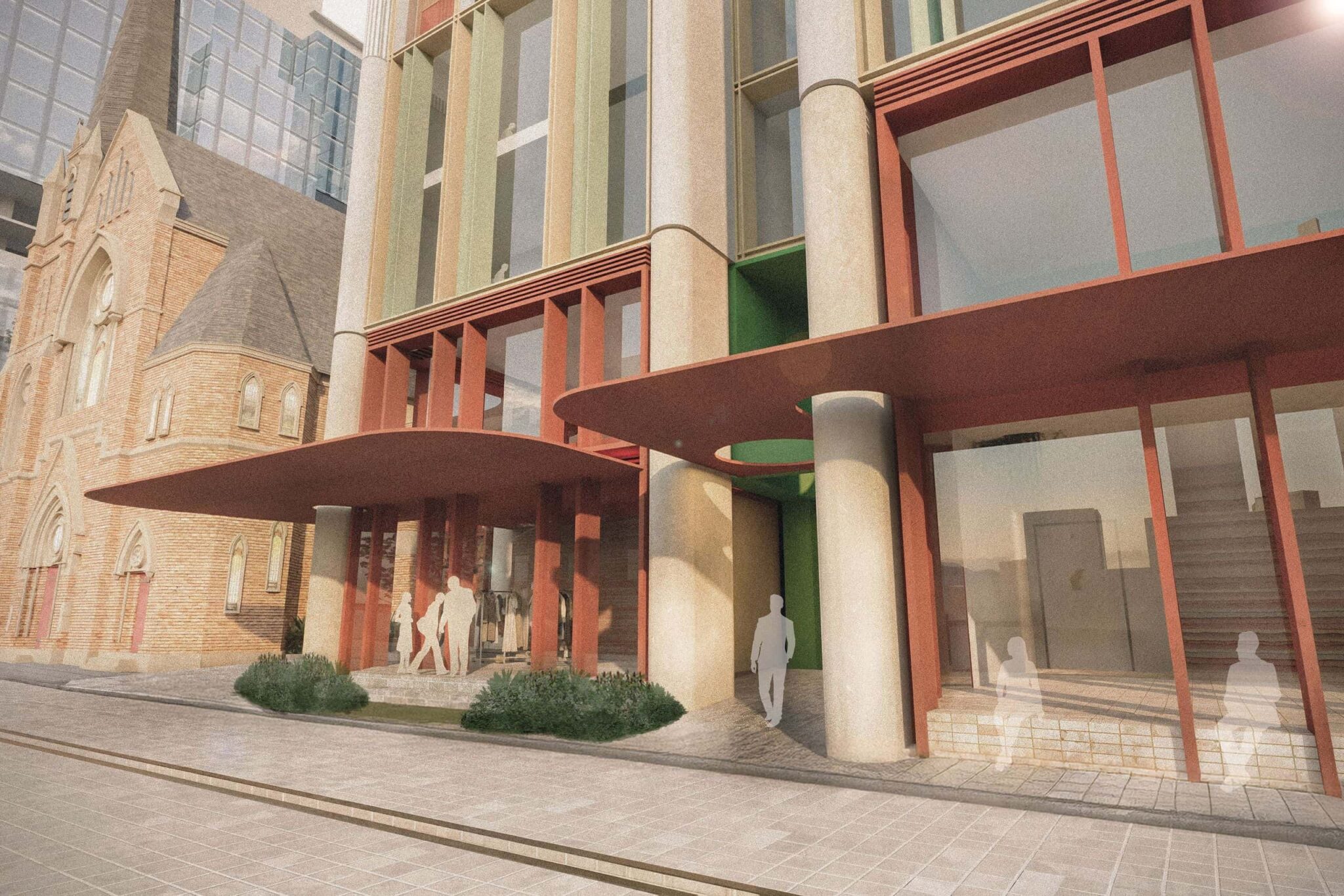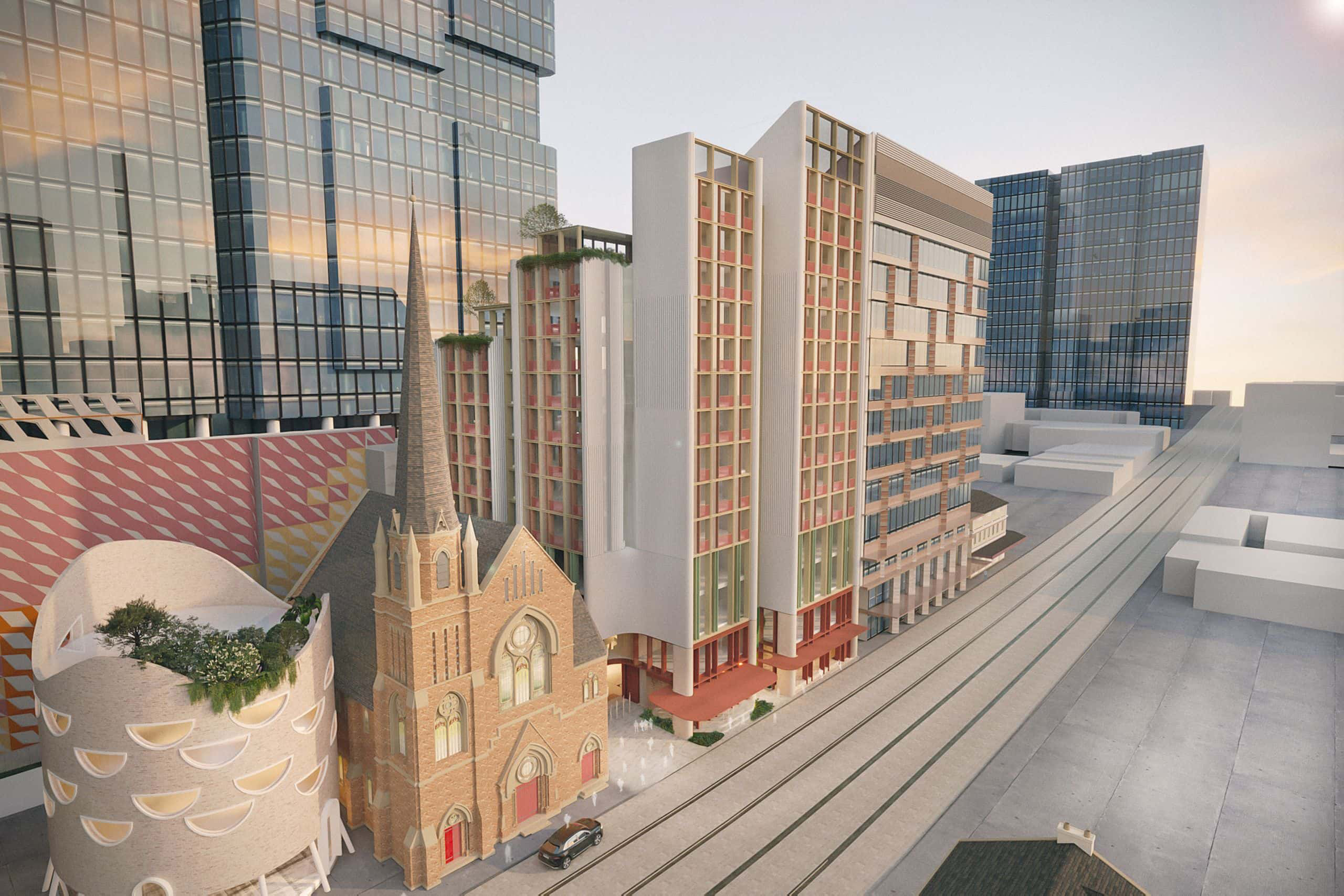 The built form will be a timeless and elegant statement consisting of two parts; a robust streetscape and public domain treatment permeating through and around the existing church curtilage, complemented by a series of stepped ‘steeples’ reminiscent of the delicate stained glass windows and craftmanship of the neighbouring church windows, carrying history forward, embedding it contemporaneously.
