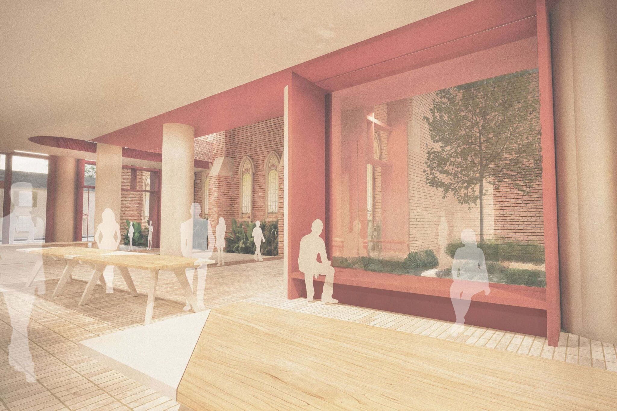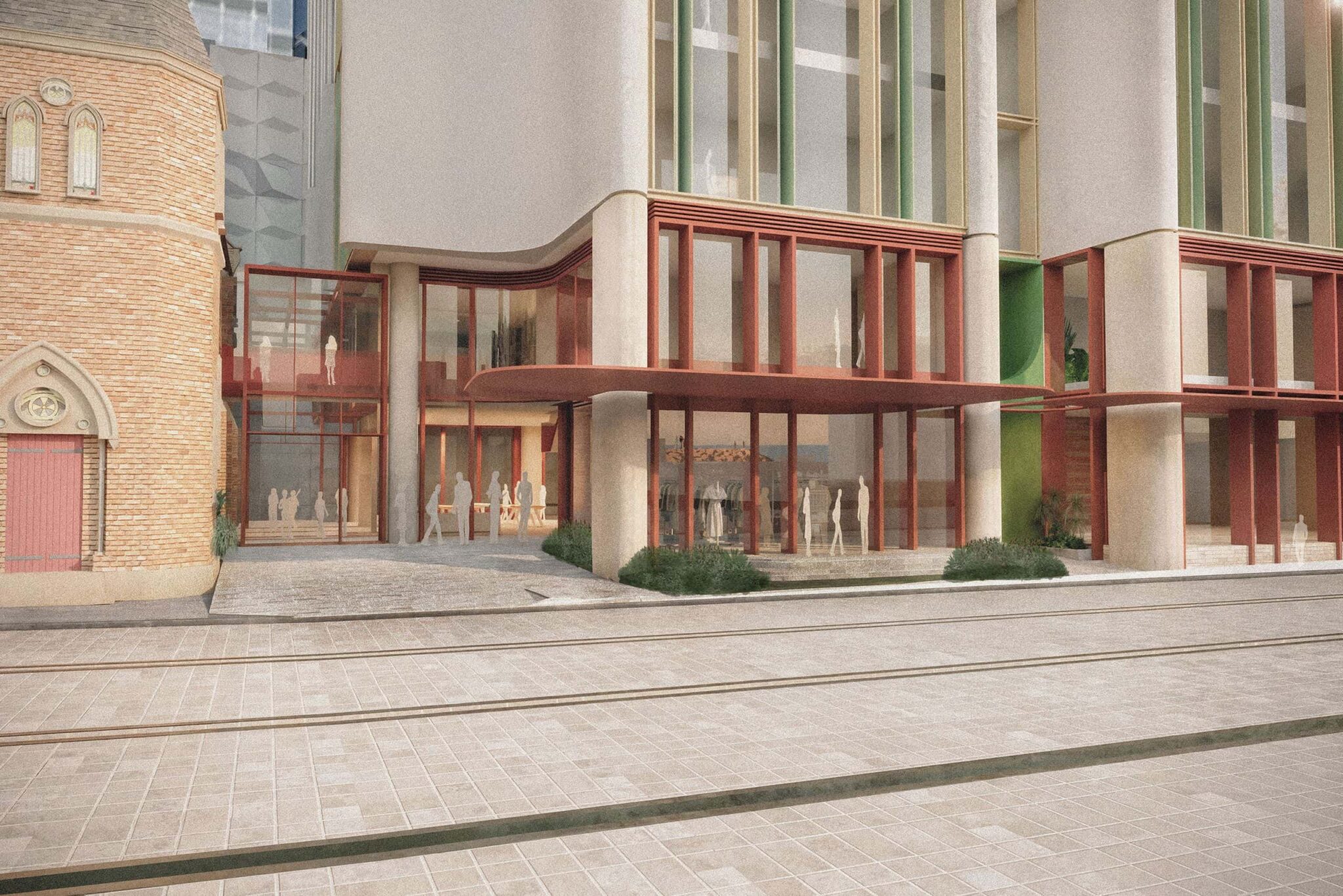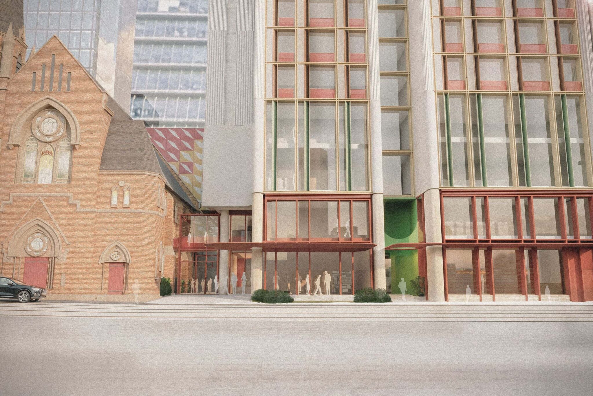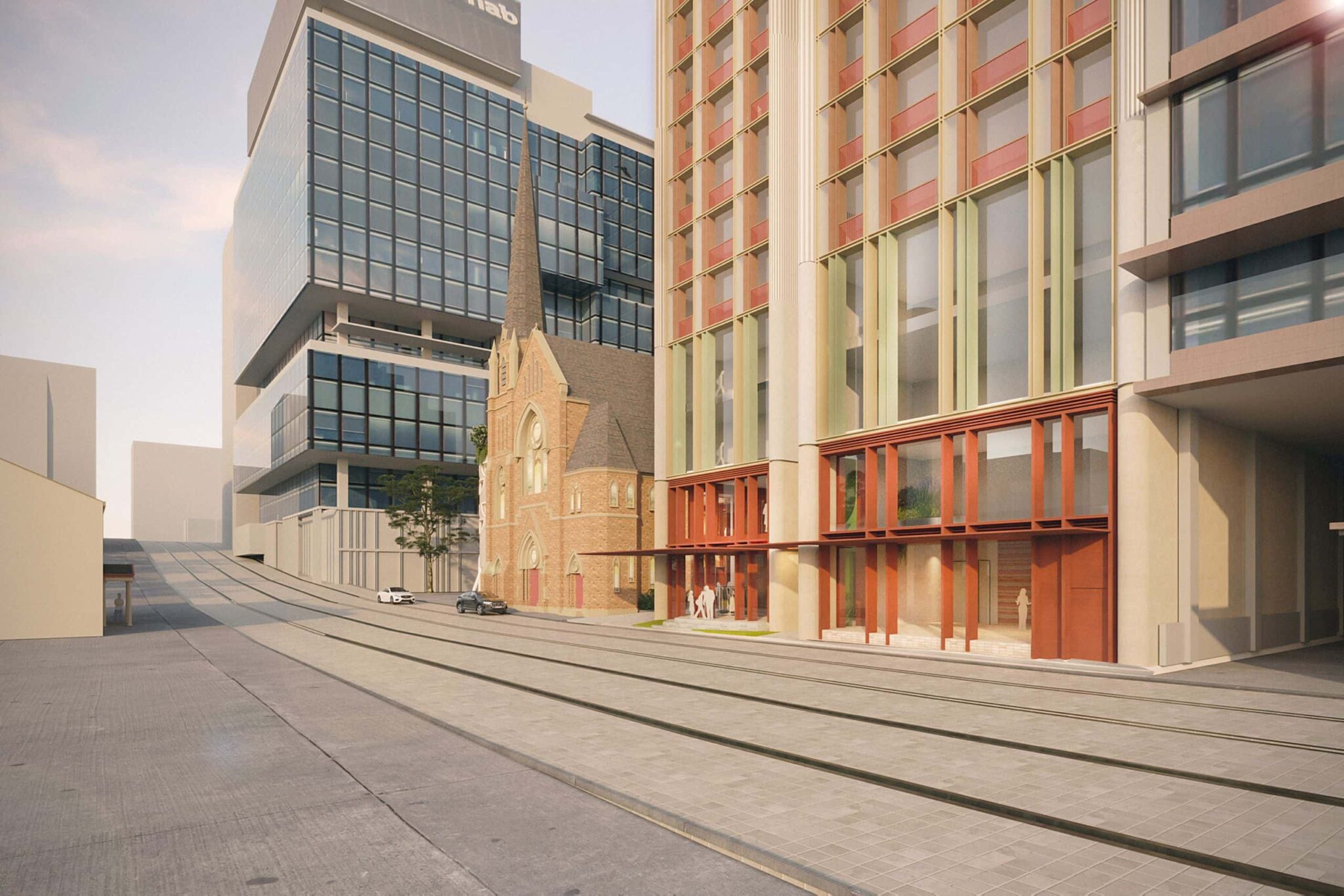 The built form will be a timeless and elegant statement consisting of two parts; a robust streetscape and public domain treatment permeating through and around the existing church curtilage, complemented by a series of stepped ‘steeples’ reminiscent of the delicate stained glass windows and craftmanship of the neighbouring church windows, carrying history forward, embedding it contemporaneously.
